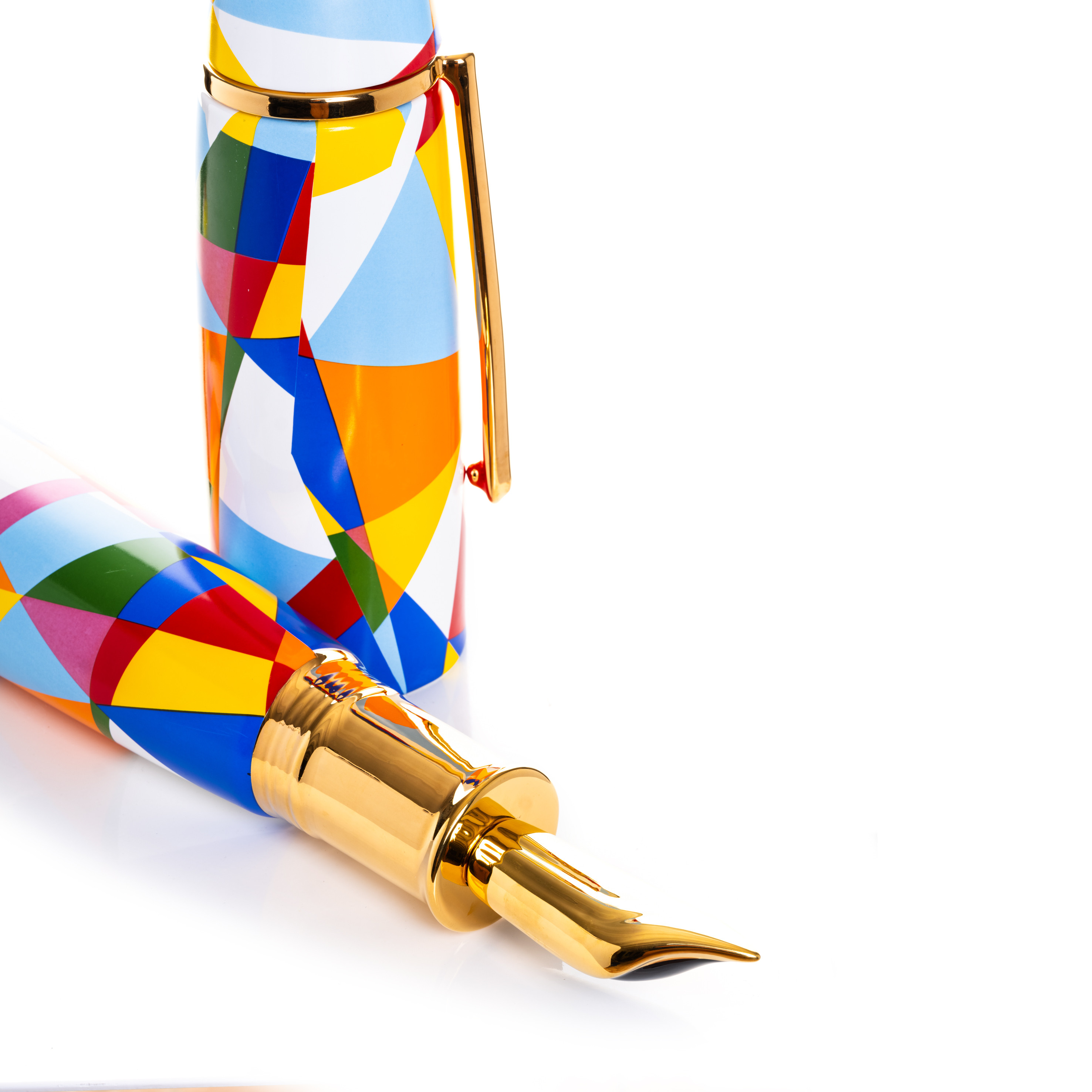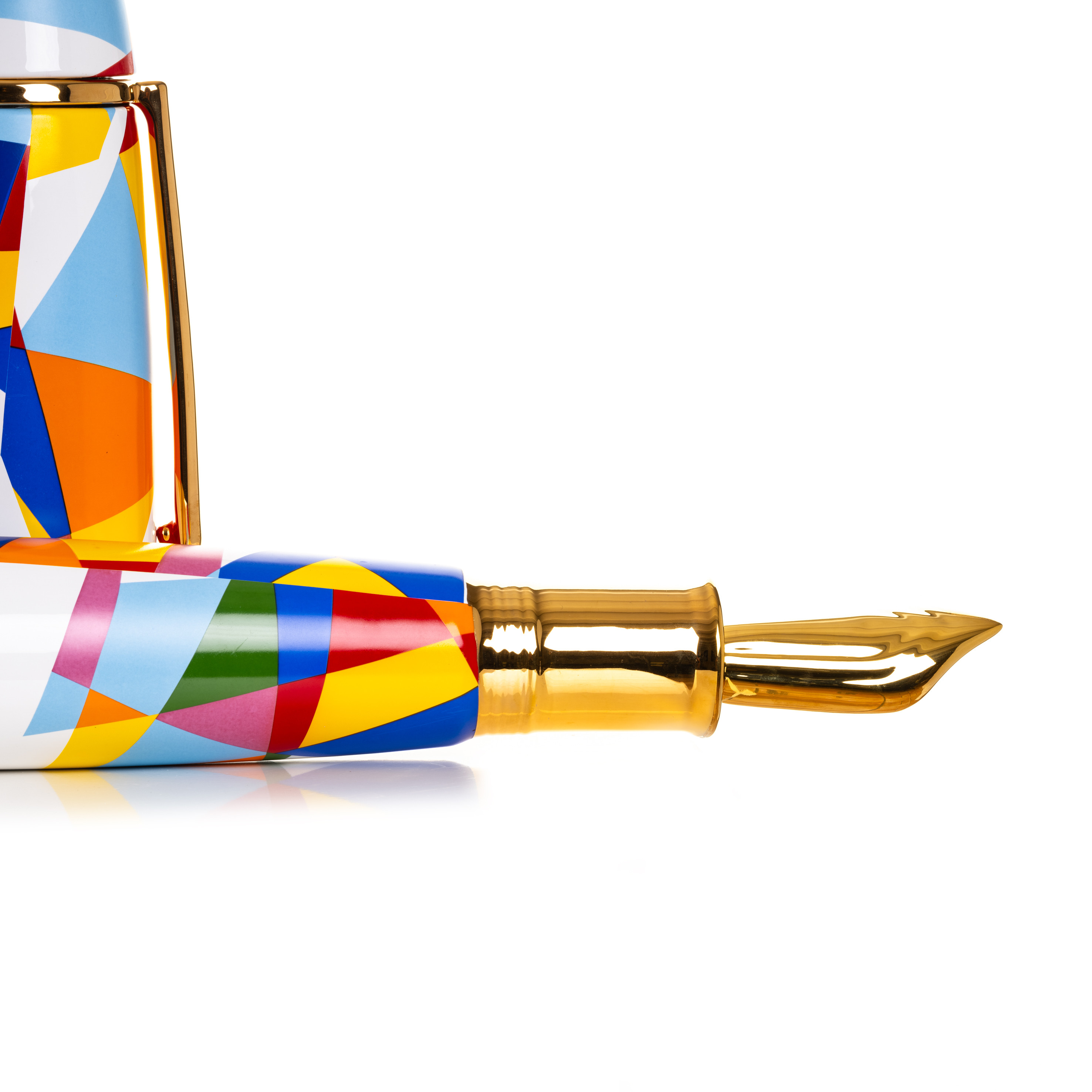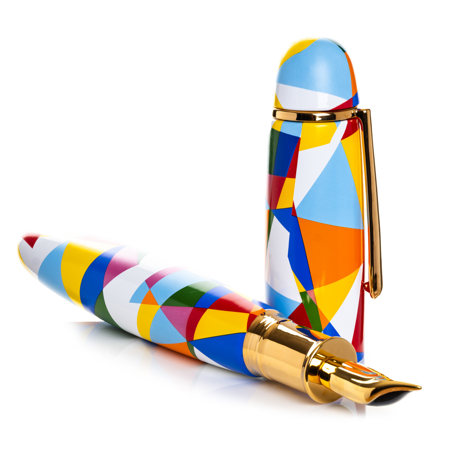 Con Stilò Arlecchino, Giorgio Laveri trasforma la penna stilografica in una scultura in ceramica smaltata dai colori vivaci e geometrici. L’opera richiama la maschera di Arlecchino con i suoi contrasti cromatici, unendo scrittura, segno e gioco teatrale. Simbolo di comunicazione e creatività, diventa un’icona pop di energia e stile.