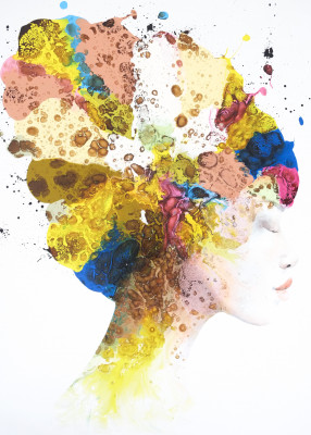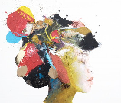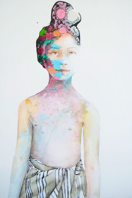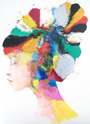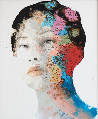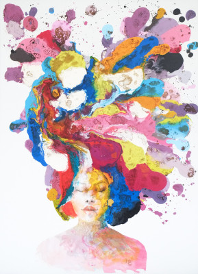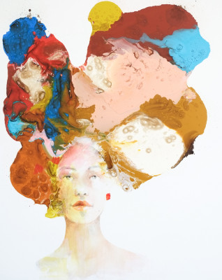 Le colature e le trasparenze creano un movimento leggero, quasi a suggerire un vento interiore che guida la scena. Una composizione che trasforma l’emozione in gesto e lascia affiorare una fragile intensità.