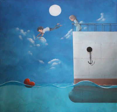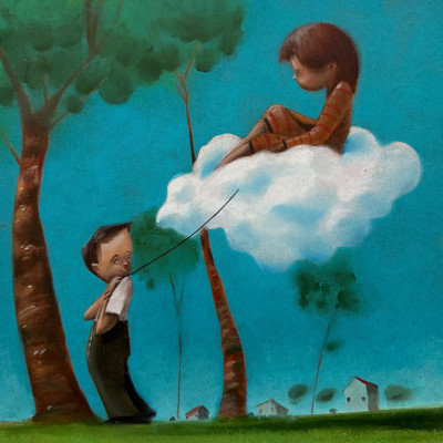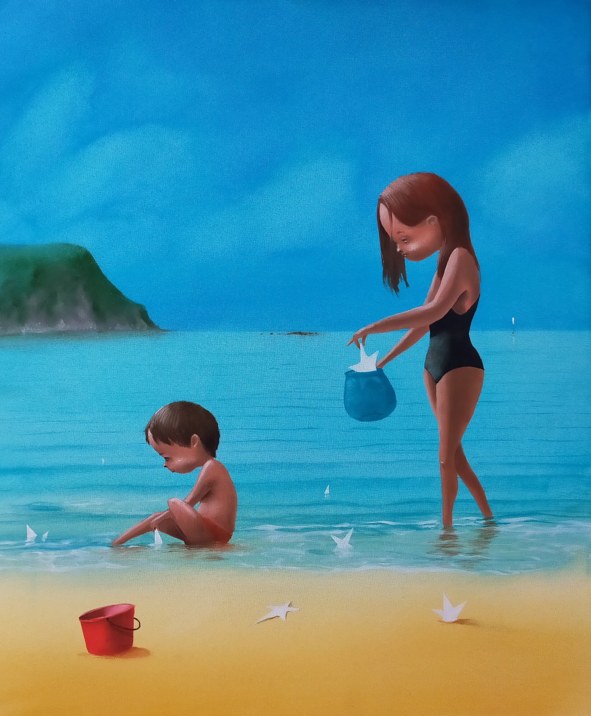In questo olio su tela, un bambino siede sulla riva del mare raccogliendo piccole “conchiglie” luminose, che somigliano a stelle cadute nell’acqua. Accanto a lui, la mamma lo aiuta con un gesto lieve, come se insieme stessero scegliendo frammenti di cielo. Il mare, con il suo azzurro profondo che si fonde con l’orizzonte, fa da sfondo a un momento di pura meraviglia.
