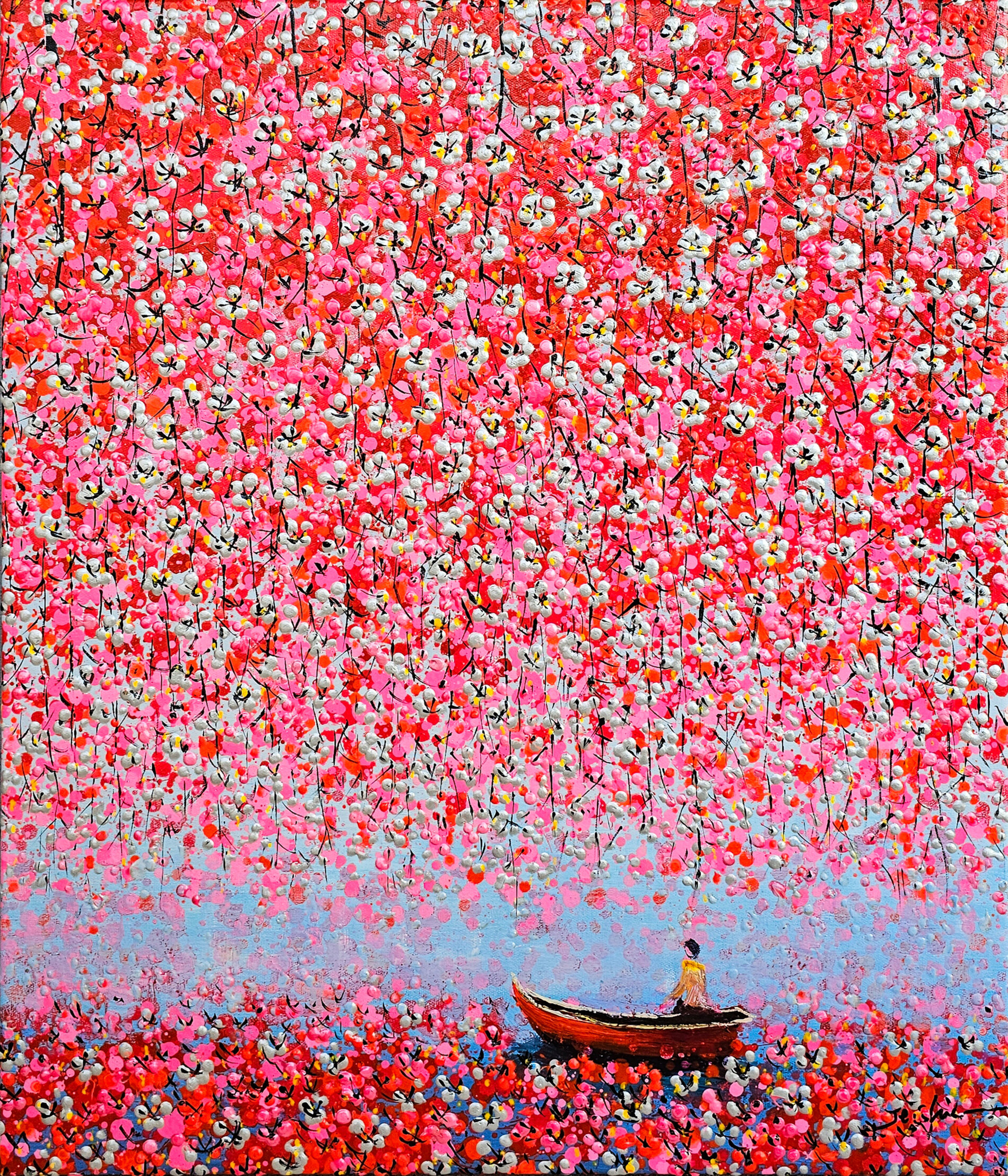 Una cortina vibrante di petali si apre su uno specchio d’acqua silenzioso. Al centro, una piccola barca ed il suo rematore diventano il punto focale della composizione, sospesi in un paesaggio che sembra fuori dal tempo. L’opera dell’artista Je Shen, intensa e immersiva, trasmette una sensazione di intimità e contemplazione, trasformando la natura in uno spazio poetico e profondamente emotivo.