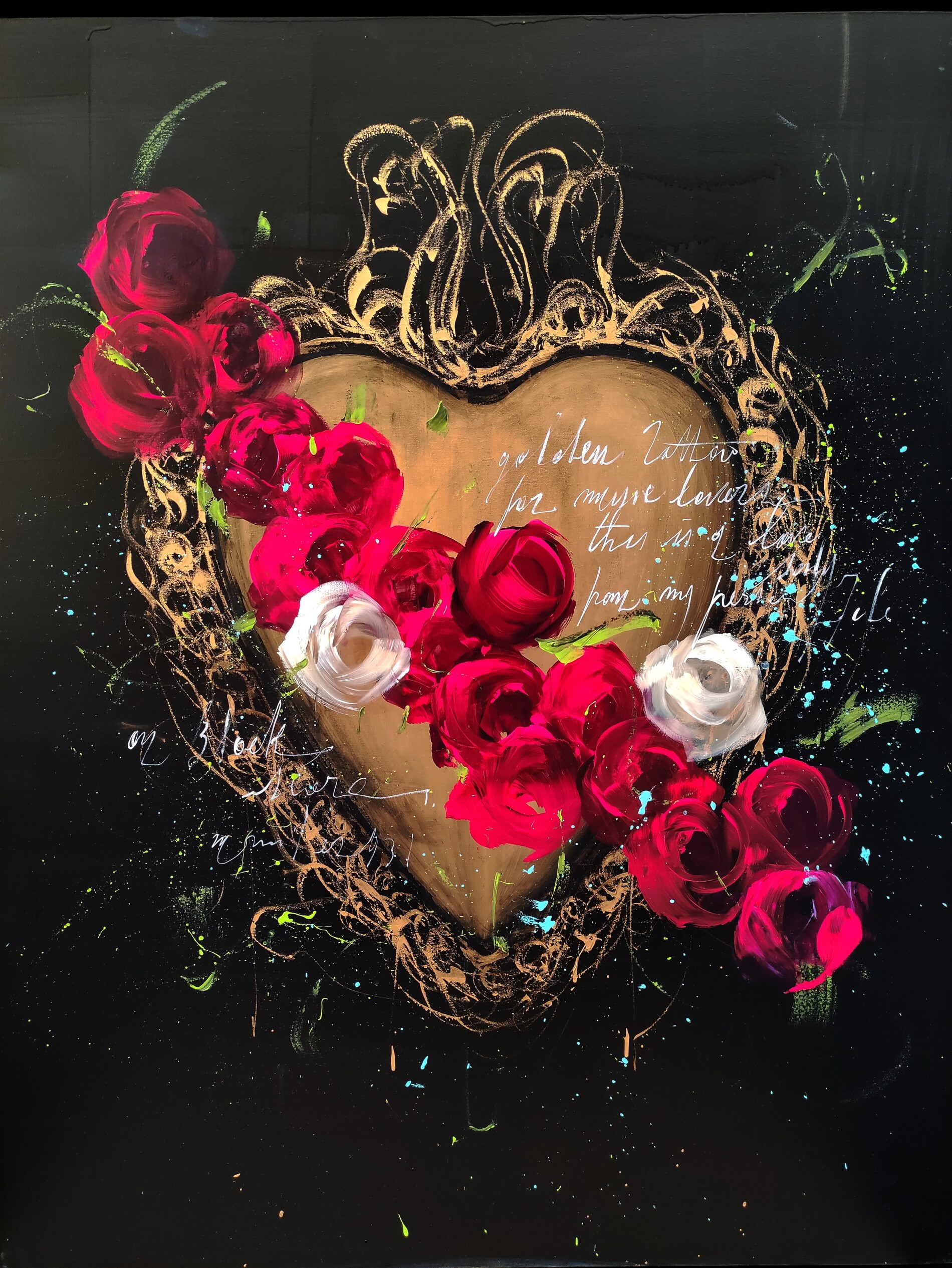 In questa composizione di grandi dimensioni dell’artista livornese Luca Bellandi, l’iconico cuore - qui declinato in un elegante oro - diventa il fulcro dell’intera scena. Le rose rosse e bianche, dipinte con pennellate istintive e cariche di energia, interrompono la perfezione della forma con un’esplosione di vitalità. Tra i colori e i segni affiorano parole appena percettibili, frammenti di pensieri che aggiungono un velo di intimità e mistero all’opera.