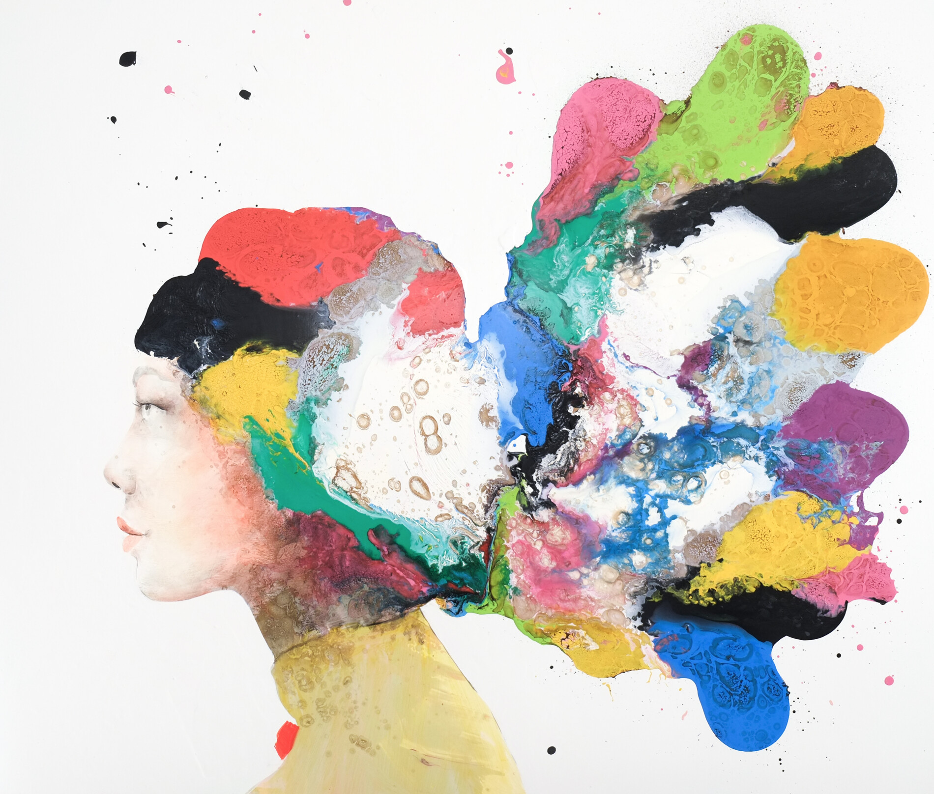 In quest’opera di grandi dimensioni in formato orizzontale macchie di blu, rosa, giallo e verde si intrecciano in forme morbide e irregolari, simili a pensieri che prendono il largo. Le colature e le trasparenze creano un movimento leggero, quasi a suggerire un vento interiore che guida la scena. Una composizione che trasforma l’emozione in gesto e lascia affiorare una fragile intensità.