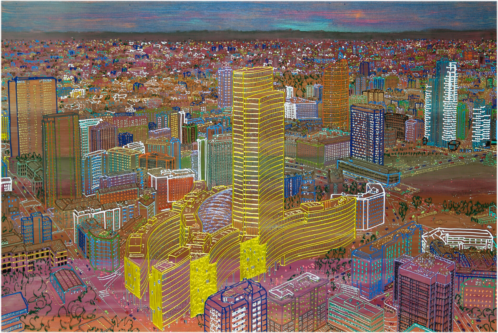 In “Aria Dura 332 Milano”, Pietro Dente cattura lo skyline contemporaneo di Porta Nuova, enfatizzando l’iconico complesso di torri di Gae Aulenti con accenti dorati e linee sinuose. La composizione, dominata da un’imponente architettura centrale che si staglia nel tessuto urbano milanese, gioca su contrasti cromatici accesi e un tratto pittorico ricco di dettagli. Le sfumature violacee del cielo al tramonto conferiscono un’atmosfera sospesa, quasi teatrale. L’opera, grazie alla tecnica mista su tela e policarbonato, restituisce una visione vibrante, stratificata e luminosa della Milano più moderna.