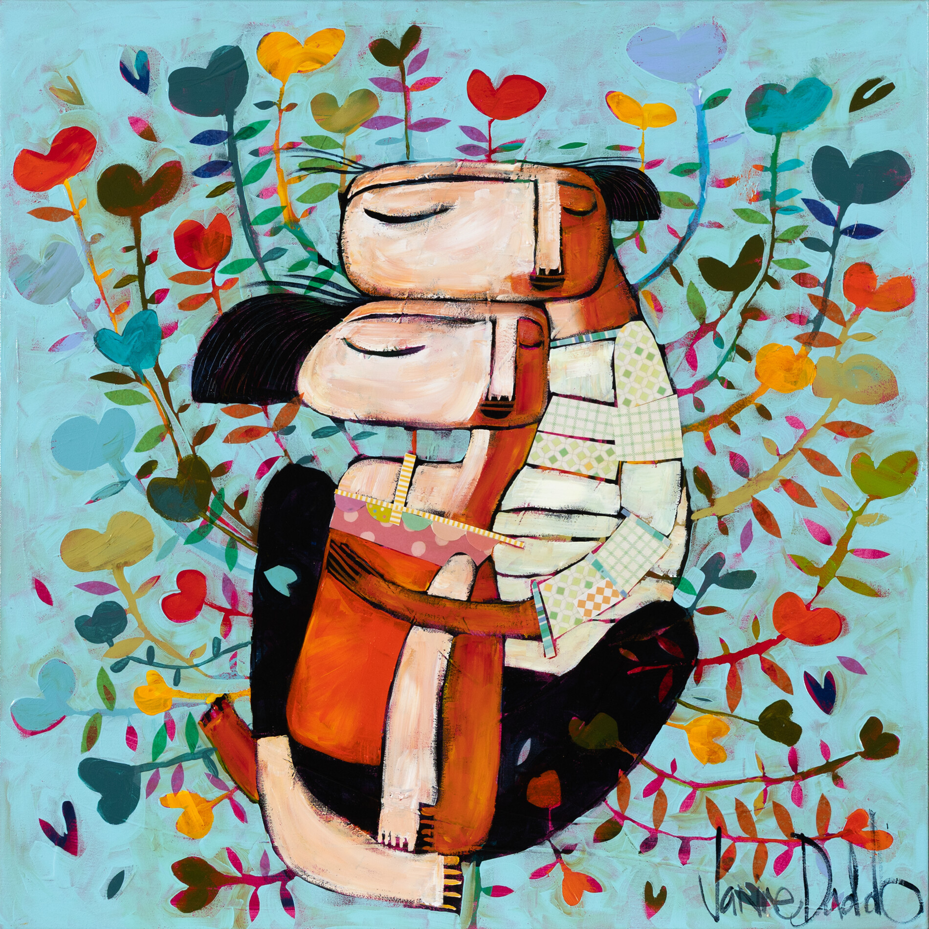 In quest’opera Janine Daddo ritrae due innamorati stretti l’uno all’altra, avvolti in un abbraccio che parla di protezione e presenza. Intorno a loro, un campo di fiori a forma di cuore in piena fioritura amplifica il senso di calore e connessione. I got you diventa così una dichiarazione silenziosa ma potente: esserci, sostenersi, non lasciarsi andare.
