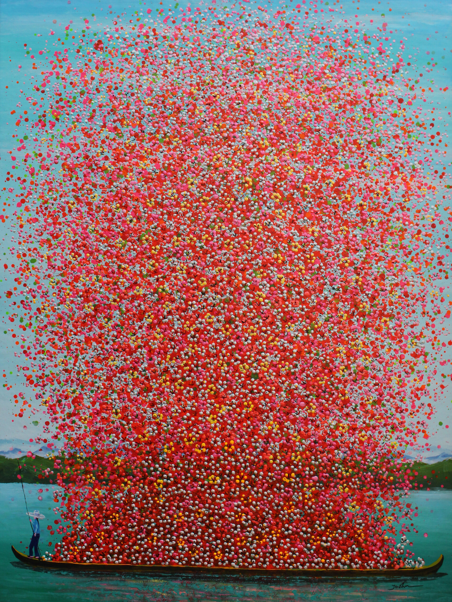 In questo dipinto di grandi dimensioni, Je Shen ci accompagna ancora una volta nel suo universo poetico attraverso uno dei suoi soggetti più iconici: la barca, simbolo ricorrente del suo linguaggio visivo, qui carica di un’esplosione di fiori. Migliaia di piccoli tocchi di colore - rossi, rosa, gialli e bianchi - si innalzano in un turbine leggero e vibrante che sembra sfidare la gravità.