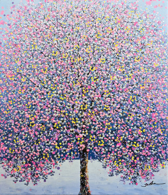 La barca, soggetto tra i più iconici della ricerca di Je Shen, diventa il punto di partenza di una fioritura vibrante e luminosa che si espande verso l’alto come un’esplosione di energia vitale. L’artista cinese trasforma la scena in una metafora di equilibrio e viaggio interiore, dove essenzialità formale e intensità emotiva convivono con grande naturalezza.
