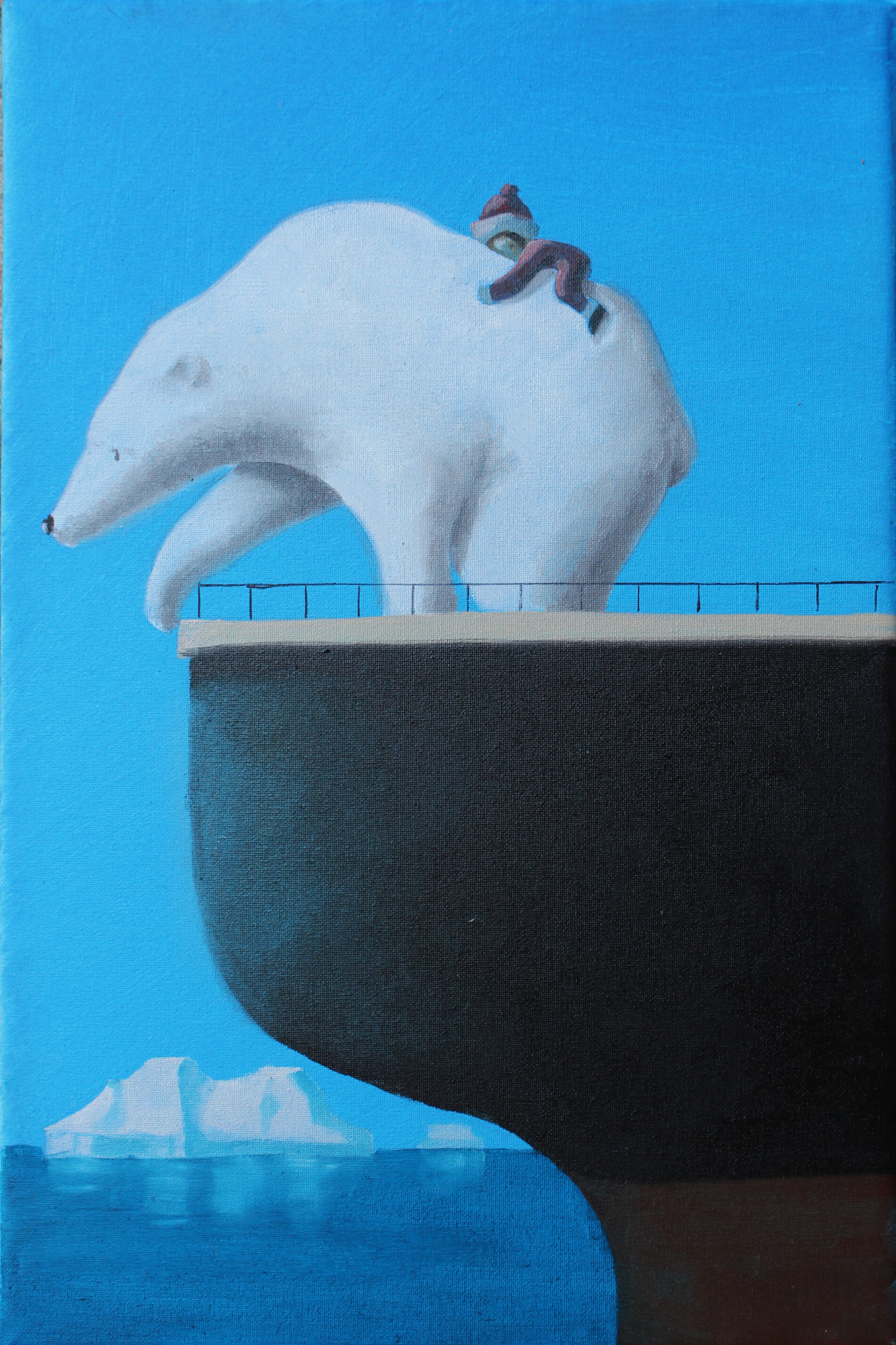 Un bambino, ben stretto nel suo cappello e nella sua sciarpa, viaggia in equilibrio sulla schiena di un grande orso polare mentre la nave su cui si trovano scivola silenziosa tra i ghiacci. Intorno, il mare e gli iceberg si confondono in un azzurro limpido che sa di lontananza e di ritorno.