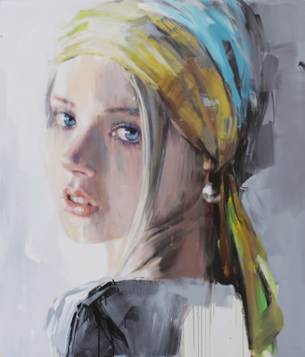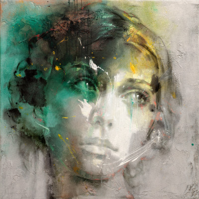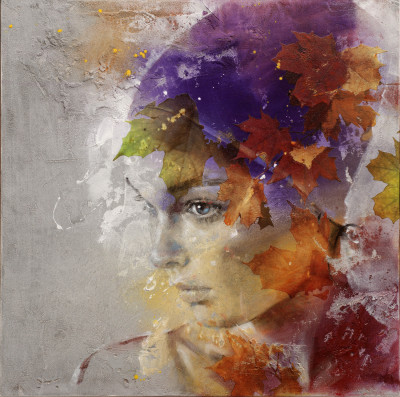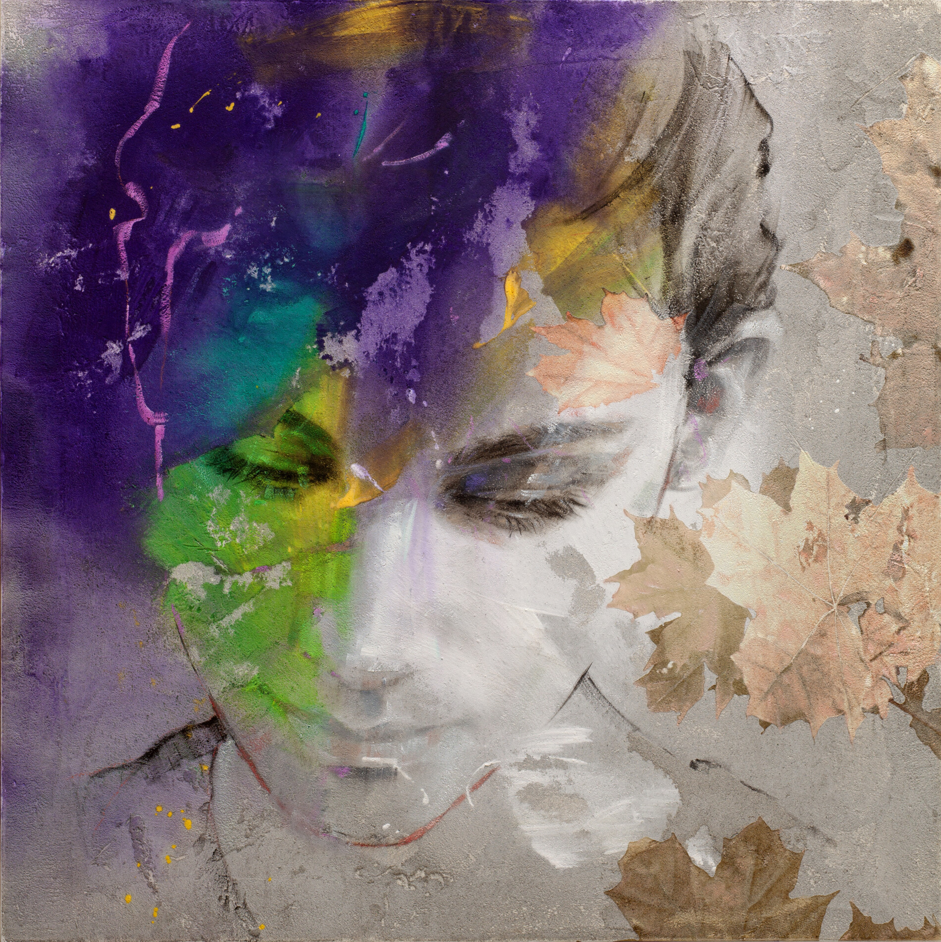 In Gemnes 14-125, Pier Toffoletti cattura la delicatezza di un volto immerso nella contemplazione. Gli occhi chiusi trasmettono pace interiore e riflessione, mentre le tonalità vivide del viola, del verde smeraldo e dell’oro vibrano sulla superficie materica della tela. Le foglie secche, realisticamente inserite nel contesto, sembrano posarsi sul volto con la leggerezza del pensiero, richiamando un’atmosfera autunnale poetica. La texture del fondo, ruvida e quasi muraria, conferisce profondità alla composizione, in un perfetto equilibrio tra figurazione e astrazione.