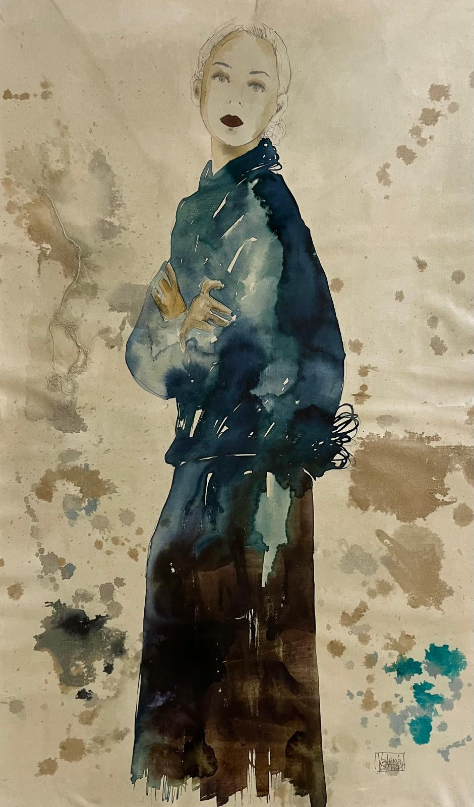 Il blu profondo del cappotto diventa campo di sperimentazione: abrasioni, trasparenze e interventi grafici interrompono la continuità formale, trasformando l’abito in spazio narrativo. La figura, essenziale e sospesa, testimonia un processo pittorico in cui il gesto resta visibile e la materia conserva memoria del fare.