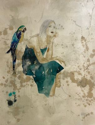 La ricerca di Valeria Patrizi si esprime attraverso una tecnica mista in cui segno, velatura e materia convivono in un equilibrio calibrato. Il colore, steso per stratificazioni fluide e colature controllate, costruisce la figura per sottrazione, lasciando emergere il corpo dalla superficie pittorica.
