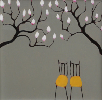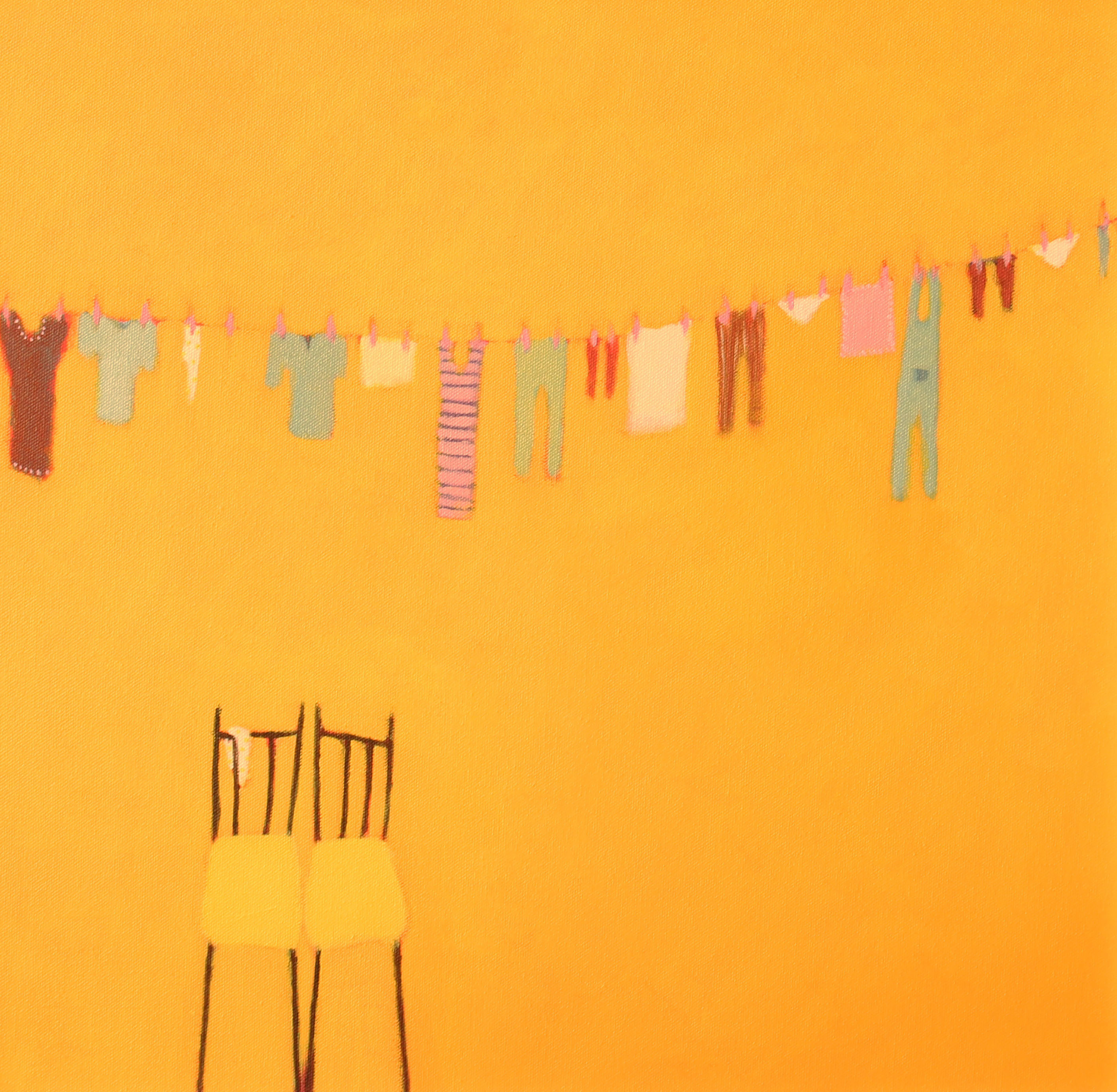 In questo quadro di Beth Richardson una sinfonia di forme e colori che delizia lo sguardo dello spettatore. In primo piano la coppia di seggioline gialle – vera e propria firma dell’artista – in fronte a una fila di colorati panni stesi ad asciguare. Una scena di quotidiana bellezza su un uniforme ed avvolgente background giallo ocra.