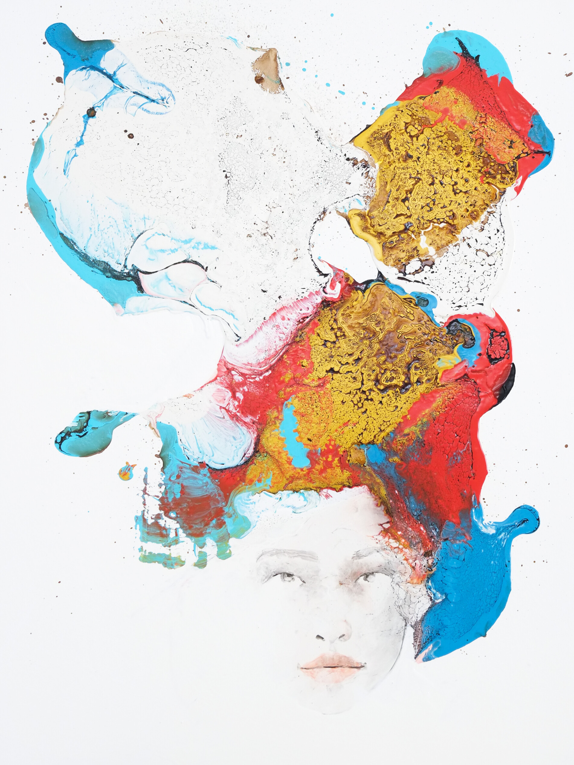 In questa composizione a tecnica mista su tela un volto affiora con una grazia quasi evanescente, come se emergesse lentamente dalla luce stessa della tela. Intorno, il colore si libera in colature di rosso, oro e turchese, intrecciando superfici dense a zone più leggere e traslucide. Le forme si aprono e si sovrappongono con naturalezza, creando un movimento che sembra nascere da un impulso interiore. L’insieme vibra come un pensiero in trasformazione, sospeso tra delicatezza e energia.
