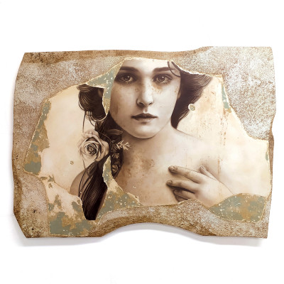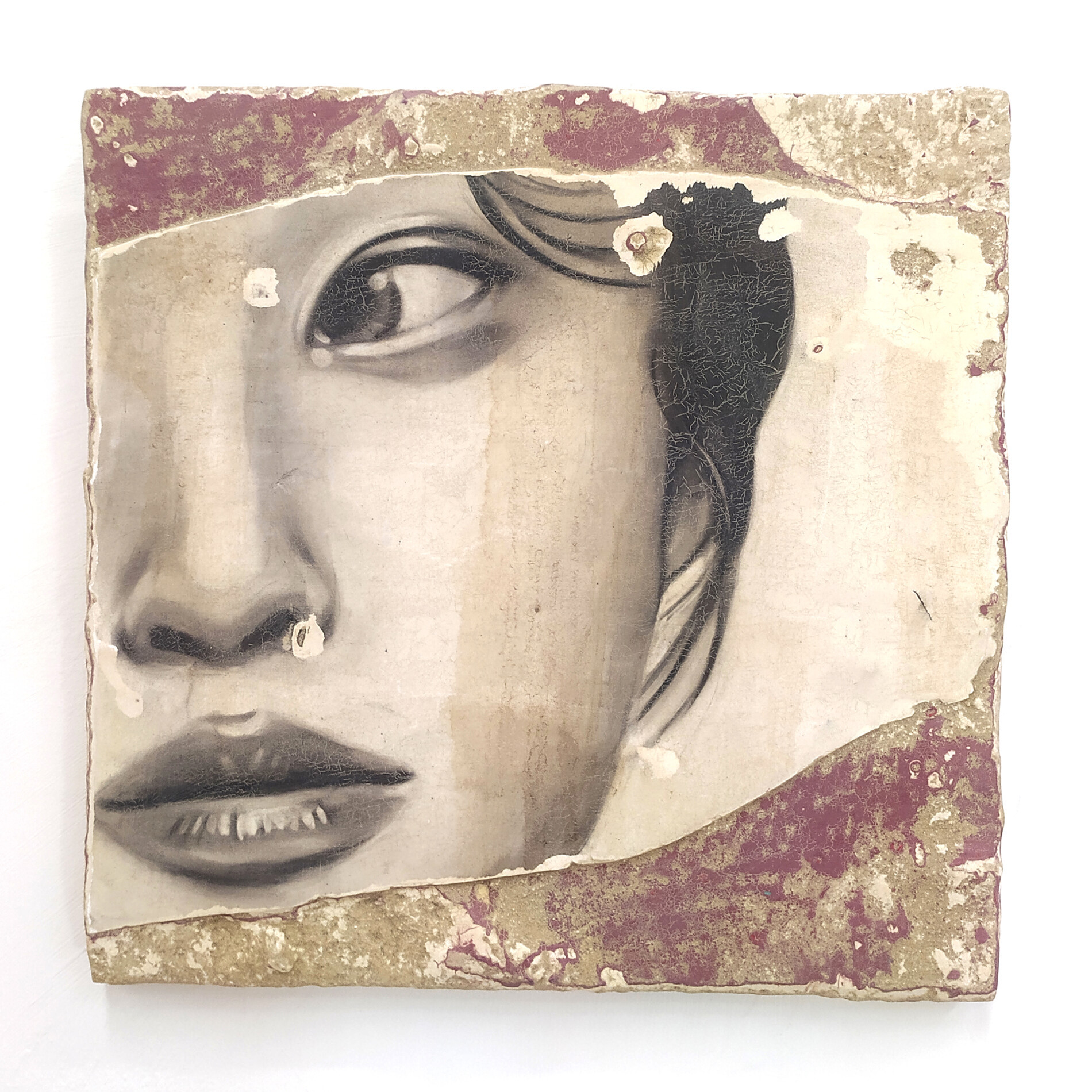 In quest’opera di piccolo formato, Toni Alfano racchiude tutta la forza del suo linguaggio in una dimensione intima e raccolta. Il volto femminile emerge con delicatezza dalla superficie consumata, come un frammento riemerso dal tempo. Piccola nelle dimensioni ma intensa nell’impatto, l’opera si configura come un frammento di memoria visiva, dove bellezza e tempo si incontrano in un equilibrio sottile e poetico.