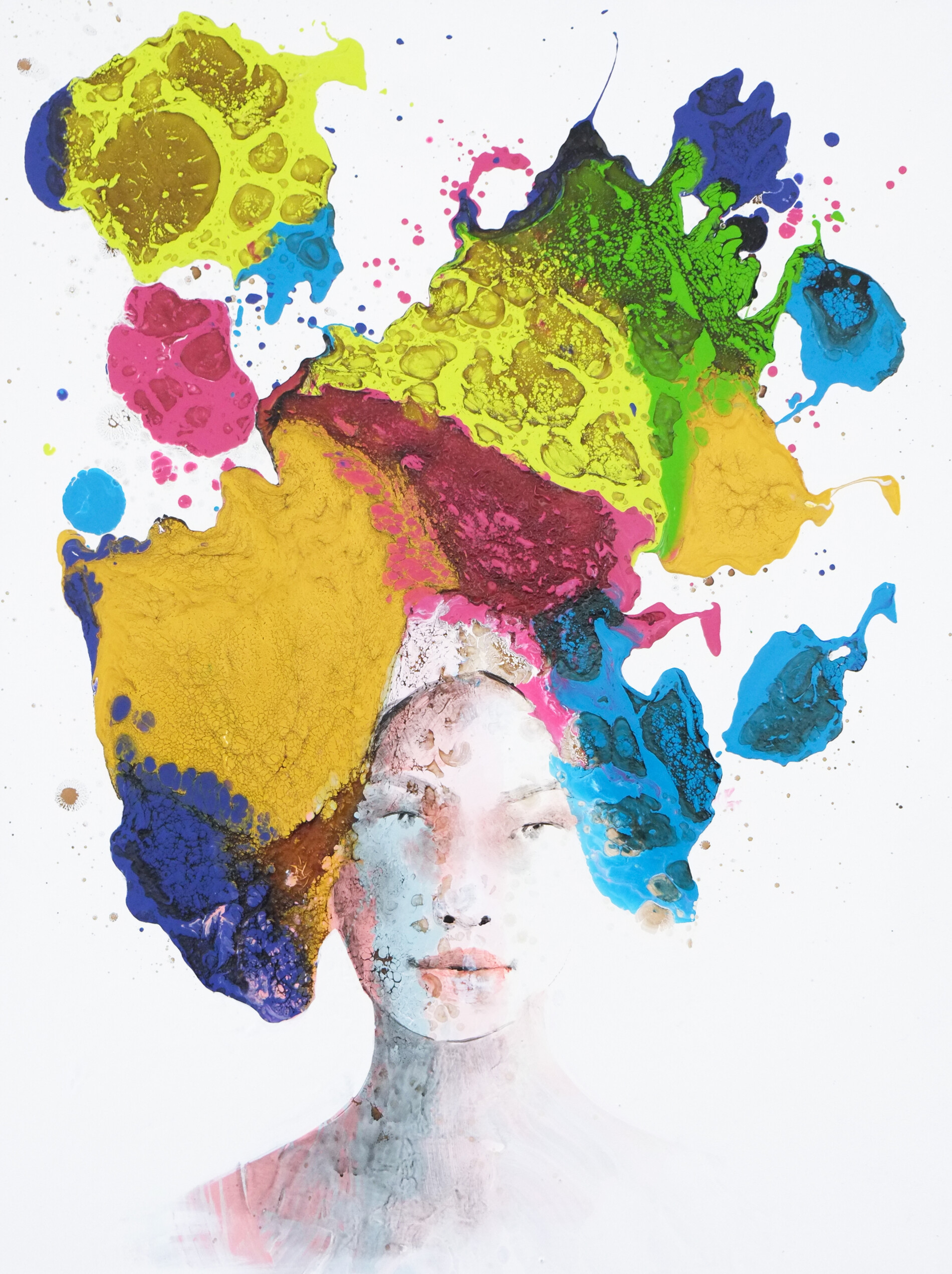 In quest’opera il colore prende il controllo della scena, sprigionandosi in una costellazione di macchie, venature e vibrazioni materiche. I gialli incandescenti, i verdi acidi, i blu elettrici e i rosa saturi dialogano tra loro come forze in collisione, generando un ritmo visivo che pulsa e si espande. Le colature e le texture, ora dense ora leggere, costruiscono un movimento interno che sembra respirare. Ne nasce un’immagine che cattura per la sua vitalità selvaggia, capace di trasformare la superficie in un’esplosione di pura energia cromatica.