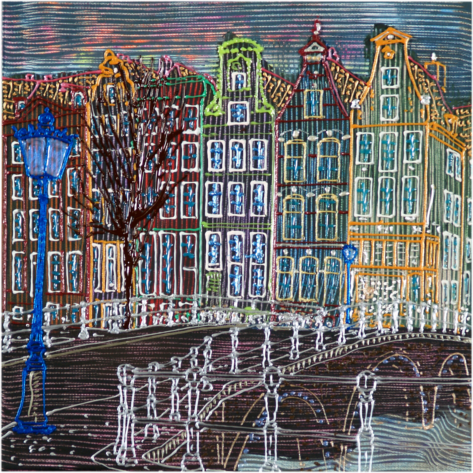 Il risultato è una Amsterdam familiare ma completamente reinventata: non una semplice veduta, ma una lettura personale della città, fatta di texture e profondità.