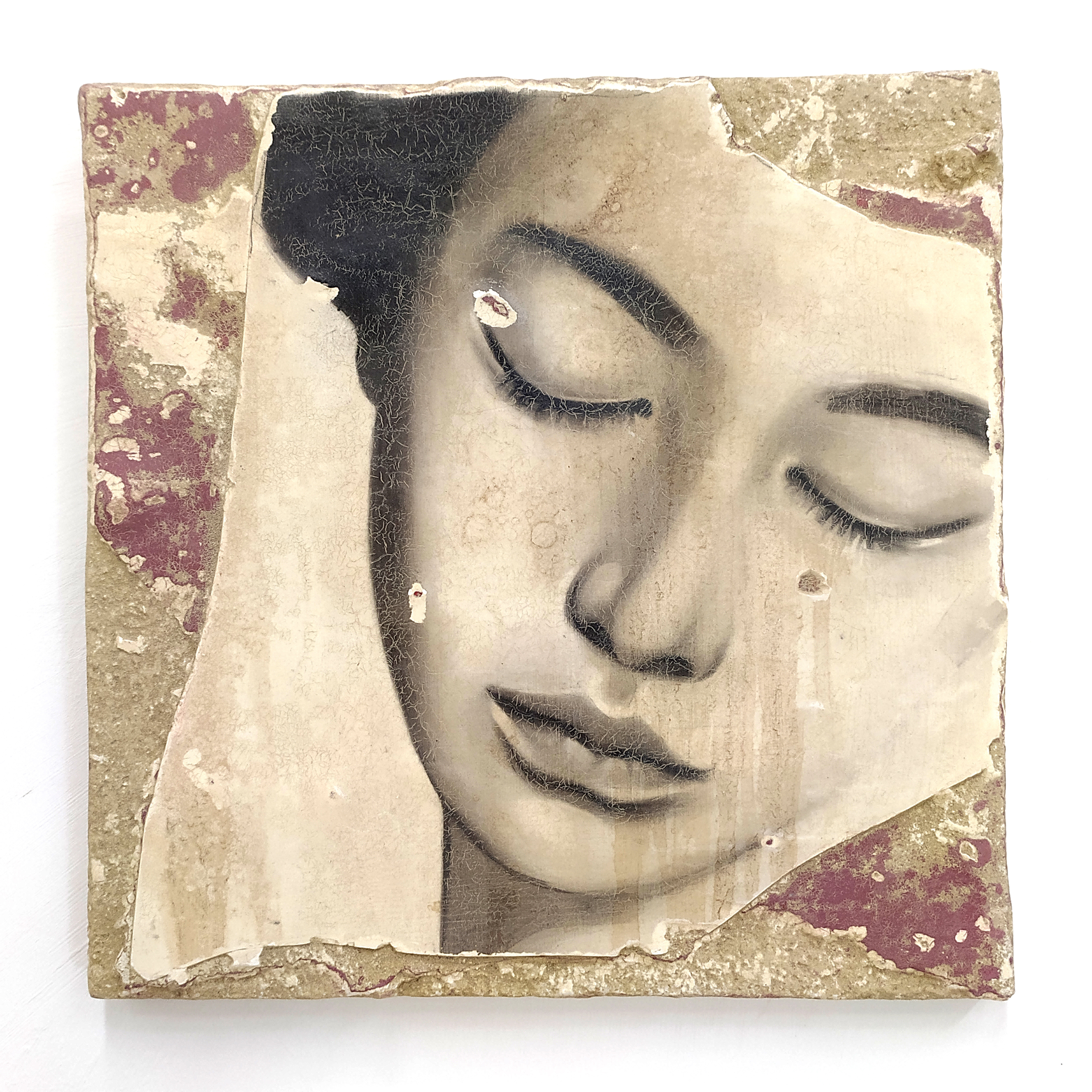 In quest’opera di piccolo formato, Toni Alfano racchiude tutta la forza del suo linguaggio in una dimensione intima e raccolta. Il volto femminile emerge con delicatezza dalla superficie consumata, come un frammento riemerso dal tempo. Piccola nelle dimensioni ma intensa nell’impatto, l’opera si configura come un’immagine sospesa, dove bellezza, silenzio e memoria si incontrano in un equilibrio sottile e poetico.