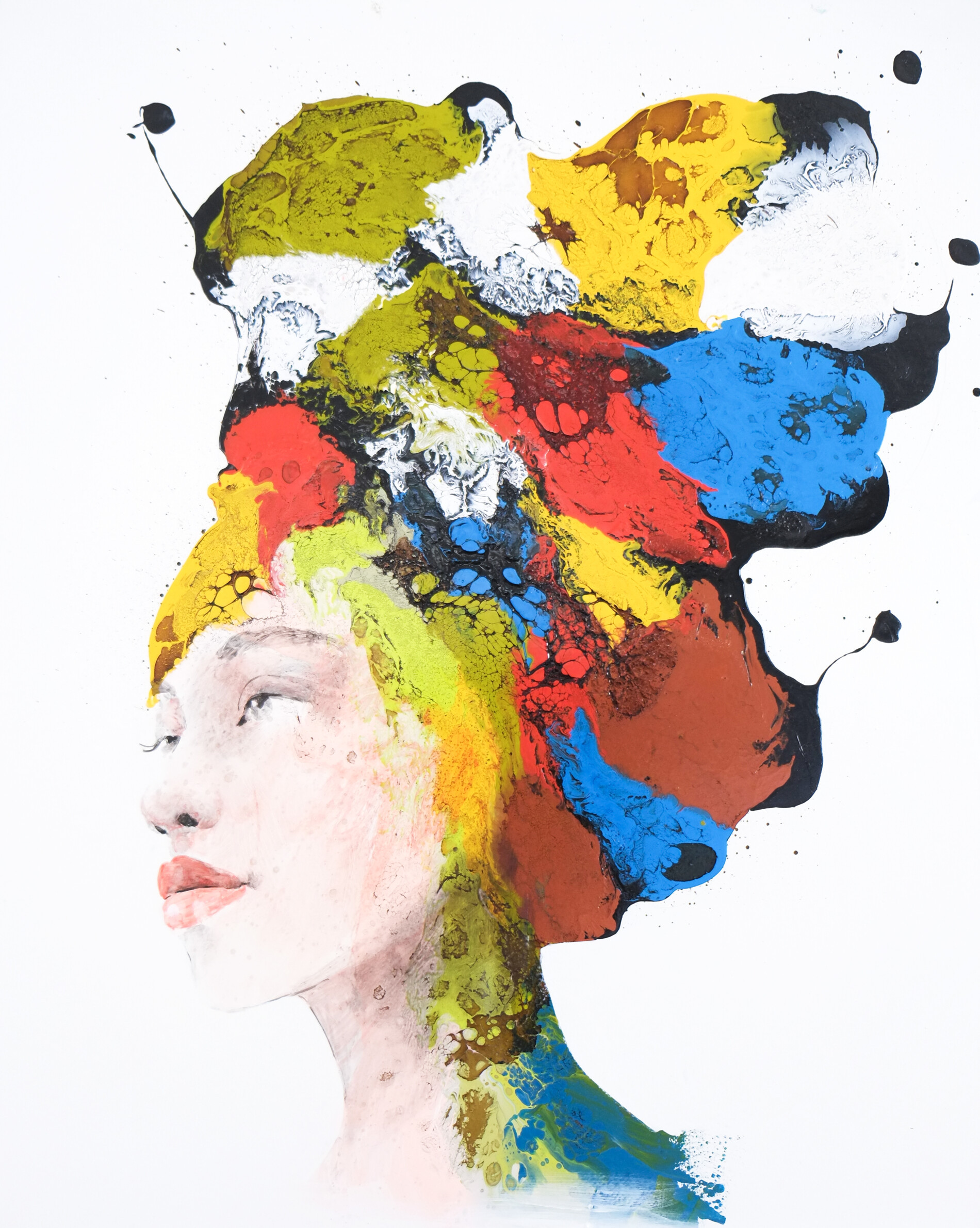 Un profilo delicato si apre verso l’alto, dove una massa di colori intensi - ocra, rosso, blu e verde - sembra prendere forma da sola, sospinta dal gesto fluido del dripping. Le texture si increspano, si addensano e poi si dissolvono, creando un movimento continuo che avvolge la figura. Ne nasce un’immagine vibrante, sospesa tra quiete e slancio, capace di catturare lo sguardo con sorprendente naturalezza.