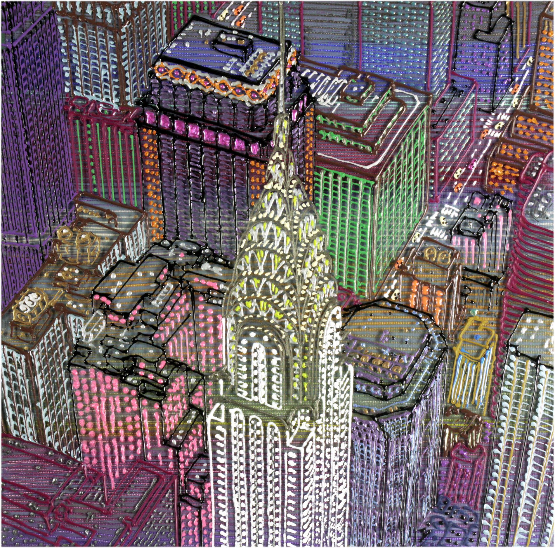 In questa veduta del Chrysler Building, Pietro Dente concentra tutto il suo linguaggio: il policarbonato inciso porta la luce in primo piano, amplificando riflessi, volumi e dettagli dell’architettura.
