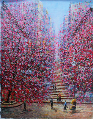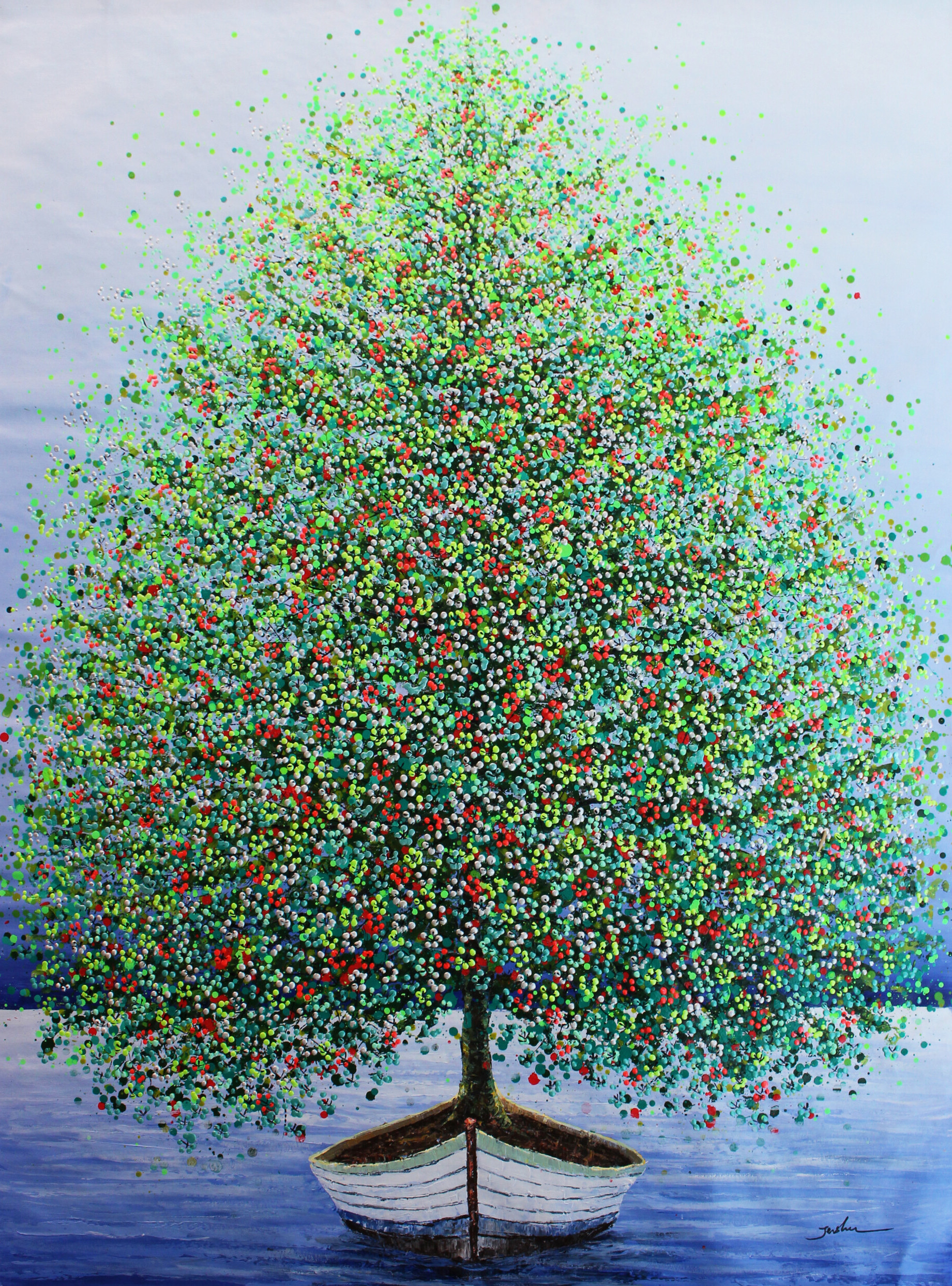 In questo olio su tela di Je Shen, una piccola barchetta diventa un vero e propio scrigno di vita: al suo interno germoglia uno dei suoi iconici alberi, ricco di colori e dettagli vibranti. Una scena che unisce il senso di viaggio e di crescita, raccontando una storia di speranza e rinascita.