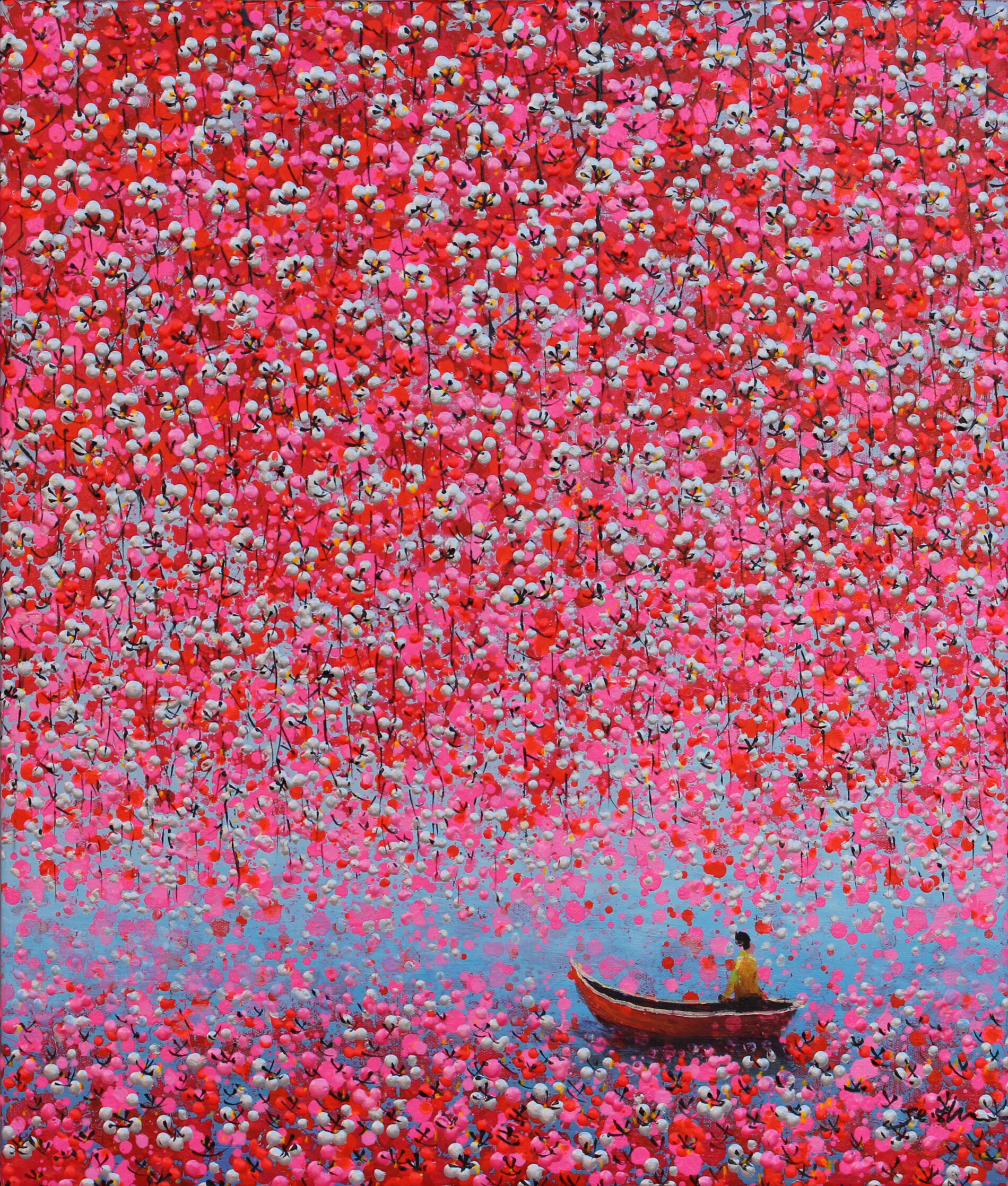 Una cortina vibrante di petali si apre su uno specchio d’acqua silenzioso. Al centro, una piccola barca ed il suo rematore diventano il punto focale della composizione, sospesi in un paesaggio che sembra fuori dal tempo. L’opera dell’artista Je Shen, intensa e immersiva, trasmette una sensazione di intimità e contemplazione, trasformando la natura in uno spazio poetico e profondamente emotivo.