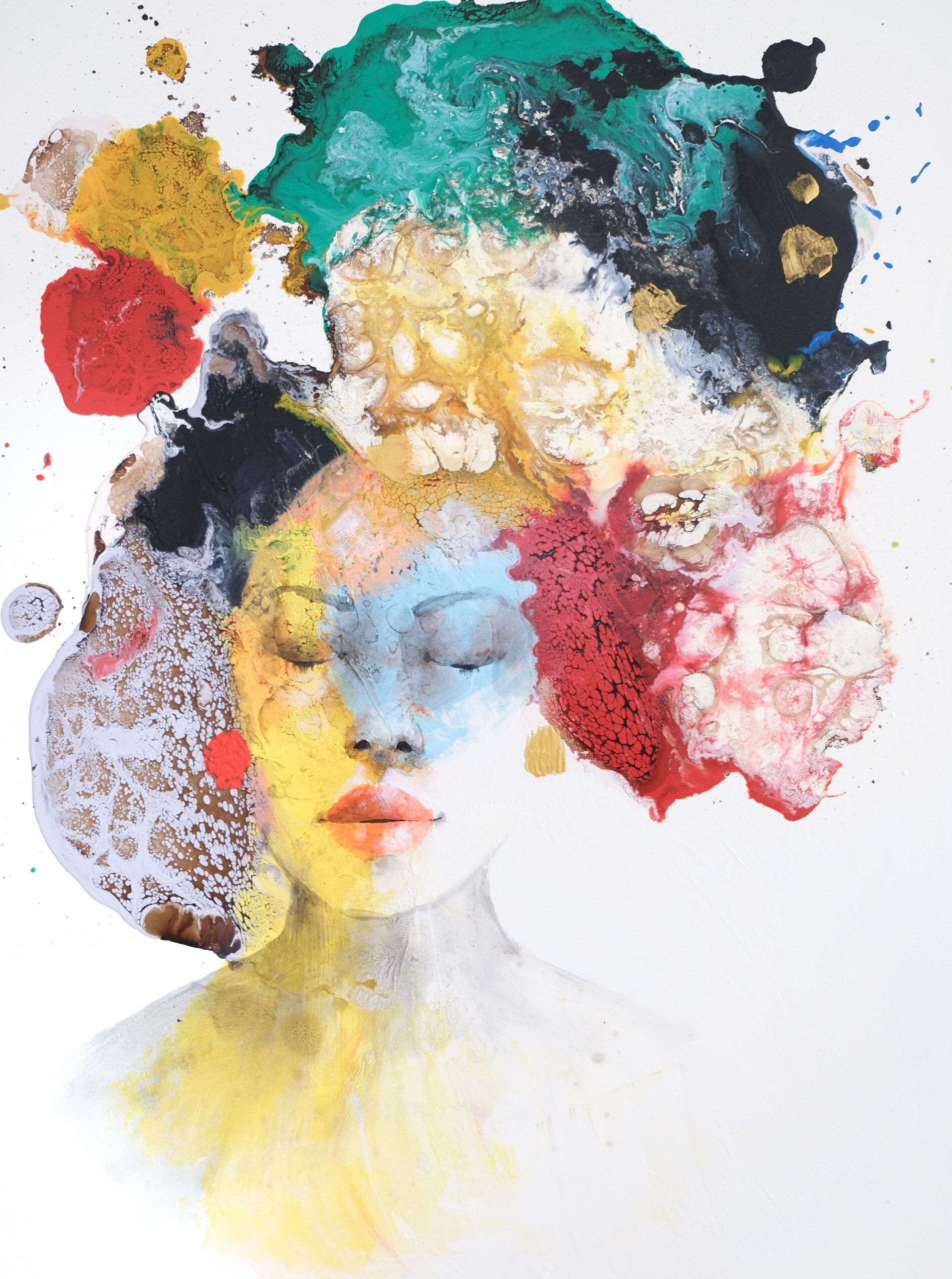Con gli occhi chiusi e il volto raccolto, il soggetto di questa composizione di Alessandro Casetti sembra abbandonarsi a un momento di meditazione silenziosa. Attorno, il colore si espande in movimenti irregolari di rosso, giallo e turchese, come pensieri che scorrono e si trasformano. Le texture degli smalti aggiungono profondità al gesto, creando un’atmosfera intima e contemplativa. Un’immagine che invita a rallentare e ad ascoltare ciò che nasce dentro.