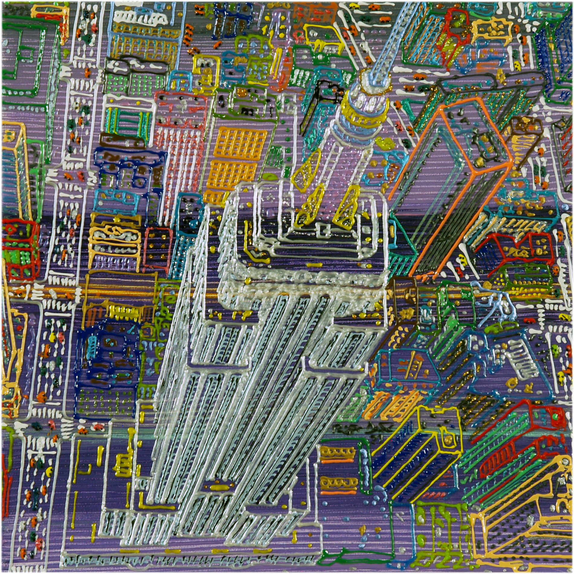 In Aria Dura 401 New York, Dente propone una visione dall’alto dell’Empire State Building costruita attraverso il suo segno caratteristico: linee incise, volumi netti e sovrapposizioni cromatiche che restituiscono il ritmo della città. La parte pittorica crea il fondo, denso e dinamico, mentre gli interventi materici definiscono le architetture e ne accentuano la luminosità. La scena è compatta, vibrante, attraversata da una rete di percorsi, edifici e dettagli che trasformano Manhattan in una mappa energetica. Una composizione che sintetizza perfettamente l'anima della serie Aria Dura: profondità, movimento e un’interpretazione personale del paesaggio urbano.