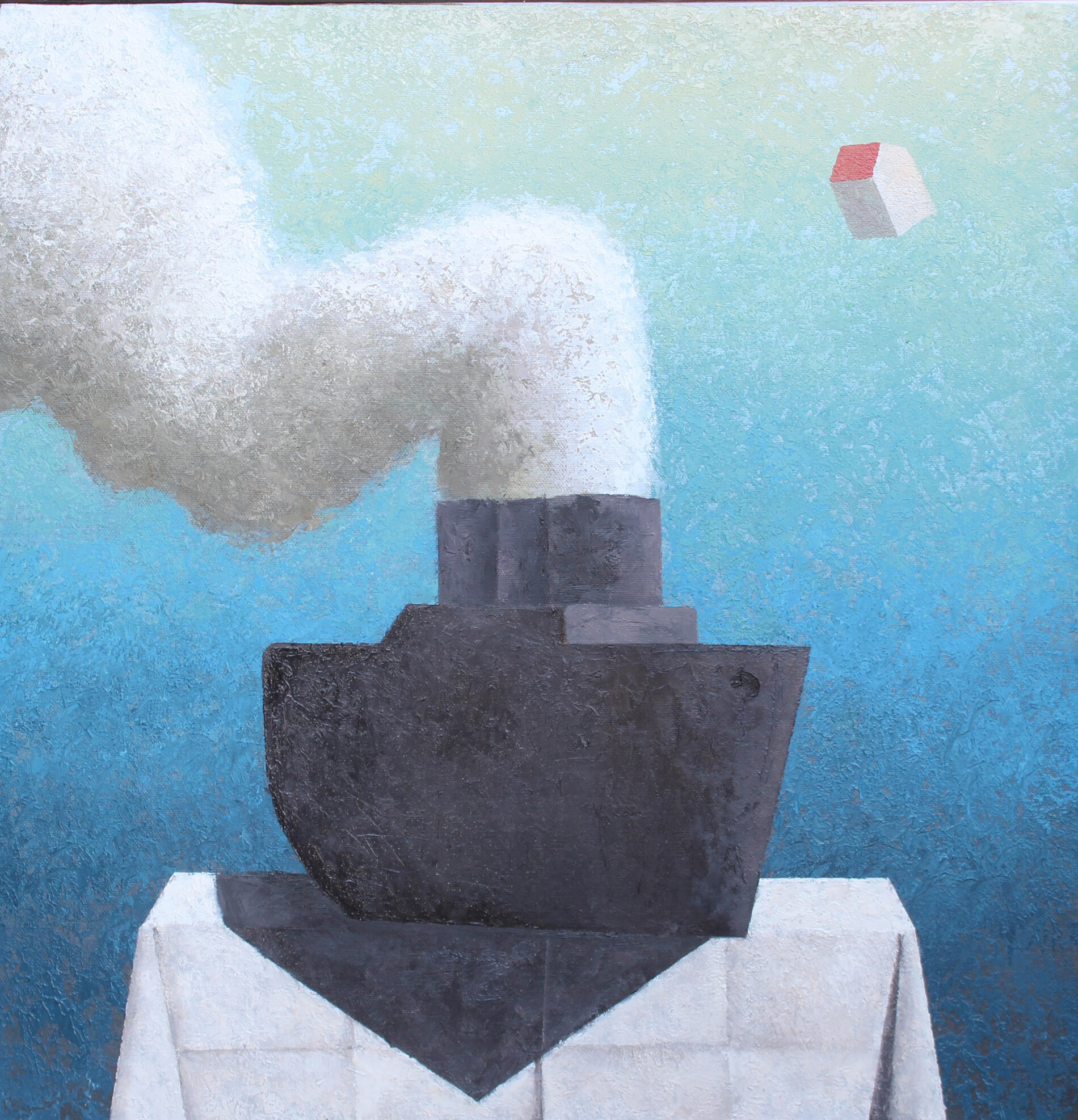 Il protagonista di questo grande olio su tela è indubbiamente il ferro da stiro fumante, che può rappresentare una nave che solca impetuosa i mari. L’ambiguità, cifra distintiva di tutte le opere di Matthias Brandes, qui si manifesta in modo esemplare: l’oggetto oscilla tra funzione domestica e immaginazione visionaria, lasciando lo spettatore esitante, alla ricerca di un significato che resta volutamente sospeso.