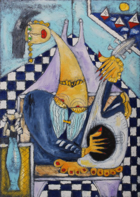 “Gallo cedrone” è un’opera che fonde naturalismo e astrazione. La figura del gallo emerge con potenza da un fondo cromatico dominato da viola profondi, gialli luminosi, aranci accesi e accenti di azzurro e verde. La materia pittorica è spessa, segnata da incisioni che conferiscono energia e ritmo. Un’immagine simbolica, tra forza animale e costruzione formale.