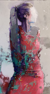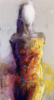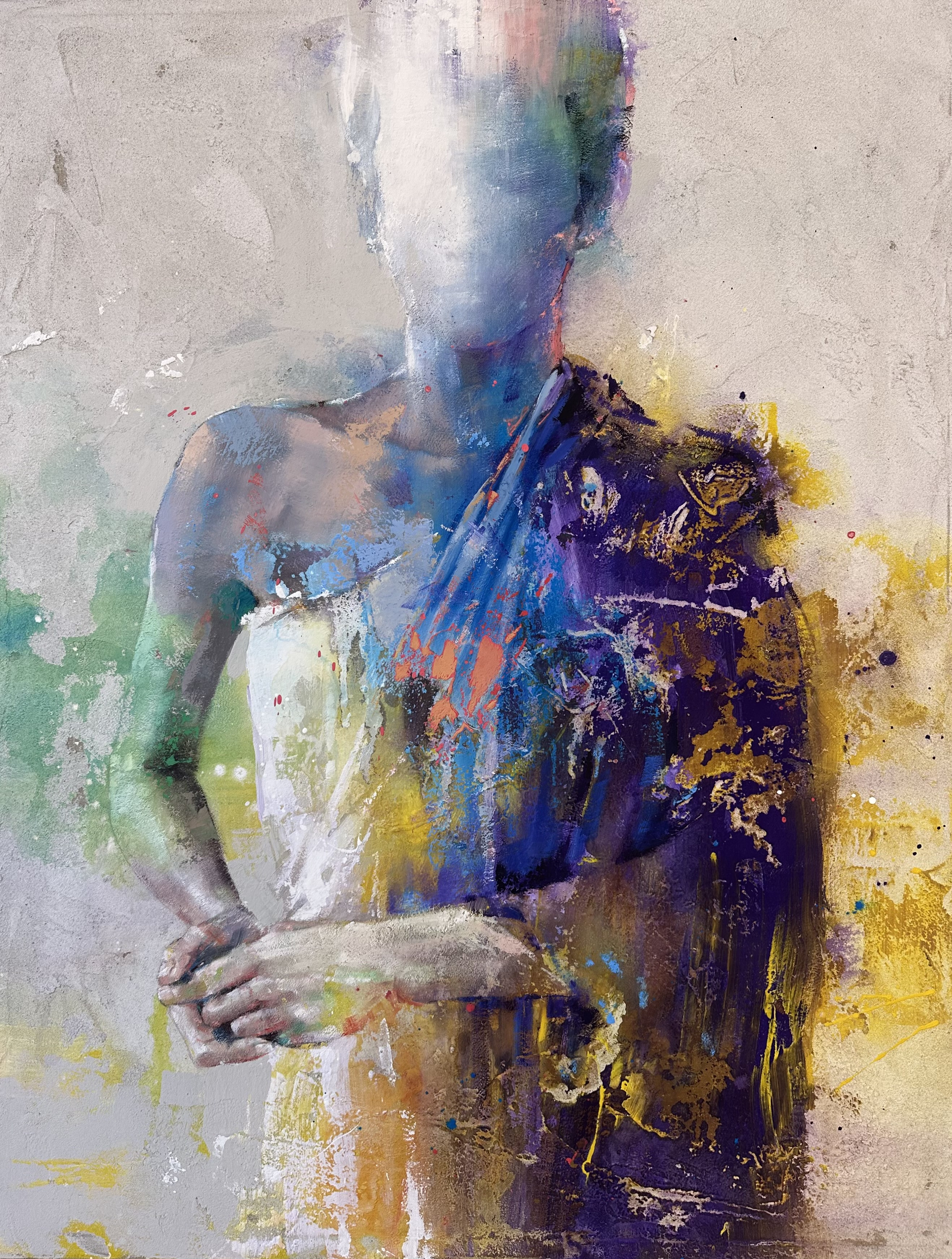 Il volto si dissolve, lasciando spazio a una presenza più universale, mentre la materia pittorica - vibrante e stratificata - costruisce un’immagine che emerge con naturalezza tra colore e luce. Il corpo diventa un campo energetico, attraversato da segni e cromie che amplificano la percezione.
