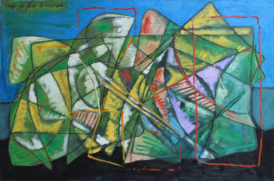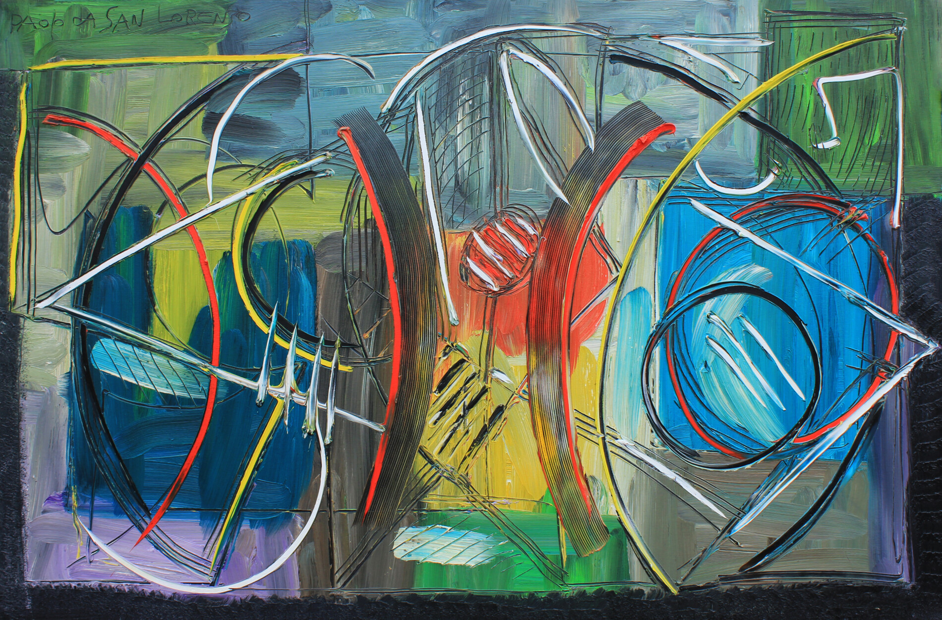 In “Papillon”, Paolo da San Lorenzo costruisce una composizione astratta di grande tensione dinamica, dove archi, traiettorie e segni curvi si intrecciano come ali in movimento. Il colore è acceso e contrastato — blu profondi, verdi, gialli e rossi vibranti — attraversato da incisioni nette che incidono la superficie. La pittura diventa gesto e ritmo, trasformando la forma in energia visiva pura.