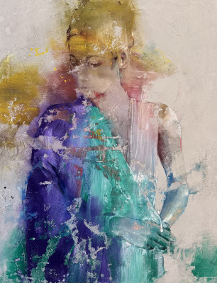 In quest'opera di grandi dimensioni di Pier Toffoletti il volto si dissolve nella luce, lasciando emergere un’identità più ampia e universale, mentre la materia pittorica - luminosa e stratificata - si accende al centro del corpo in un’esplosione cromatica vibrante. Il colore diventa energia, attraversa la figura e la anima, trasformandola in un punto di incontro tra percezione e sensazione.