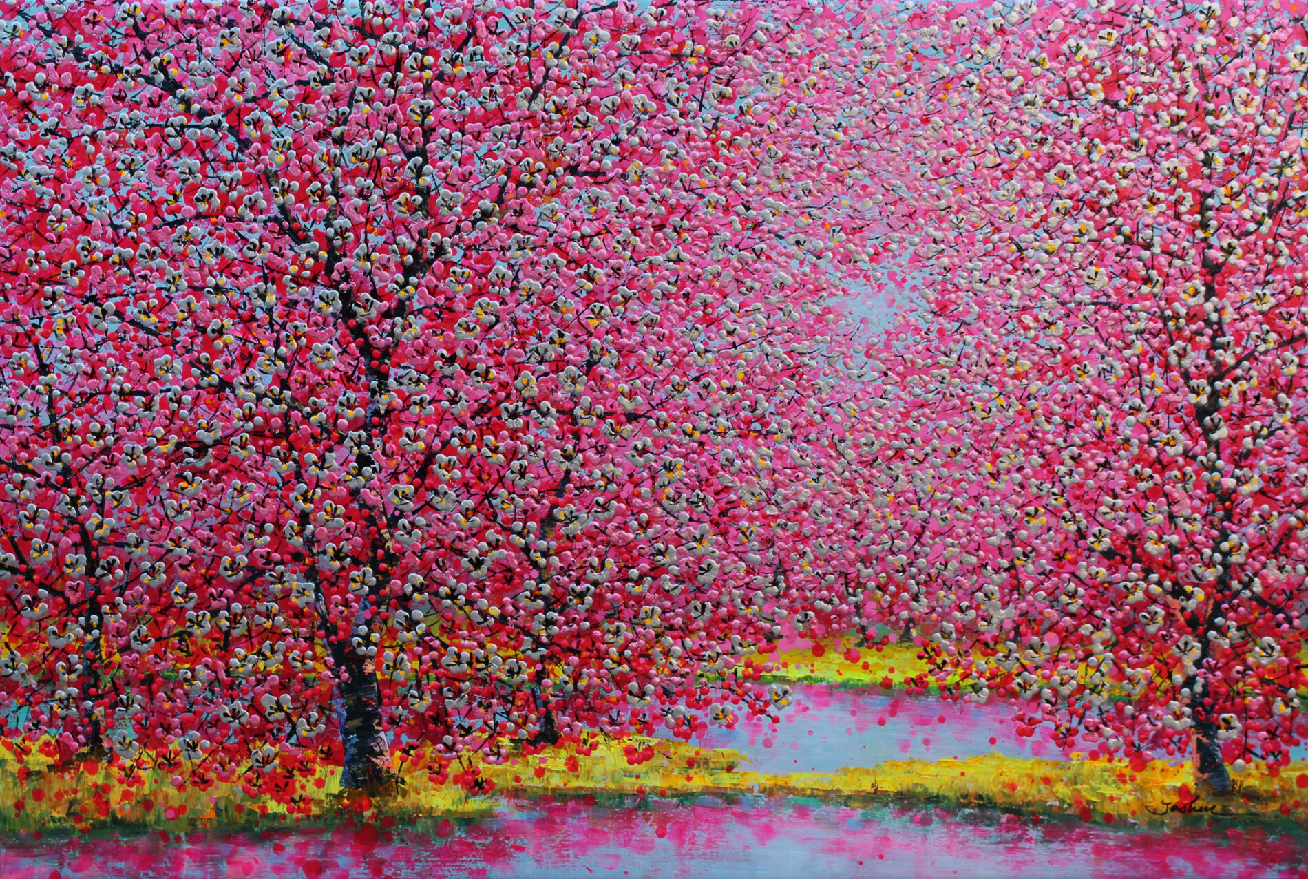 In questa luminosa composizione, Je Shen conduce lo spettatore in un sentiero di pura meraviglia visiva: un corso d’acqua azzurro attraversa un tripudio di fiori multicolori, creando un paesaggio quasi sospeso tra realtà e sogno. La ricchezza cromatica e la minuziosità del tratto trasformano la scena in un inno alla vitalità della natura, esaltando lo stile inconfondibile di Je Shen e la sua capacità di evocare emozioni attraverso la luce e il colore.