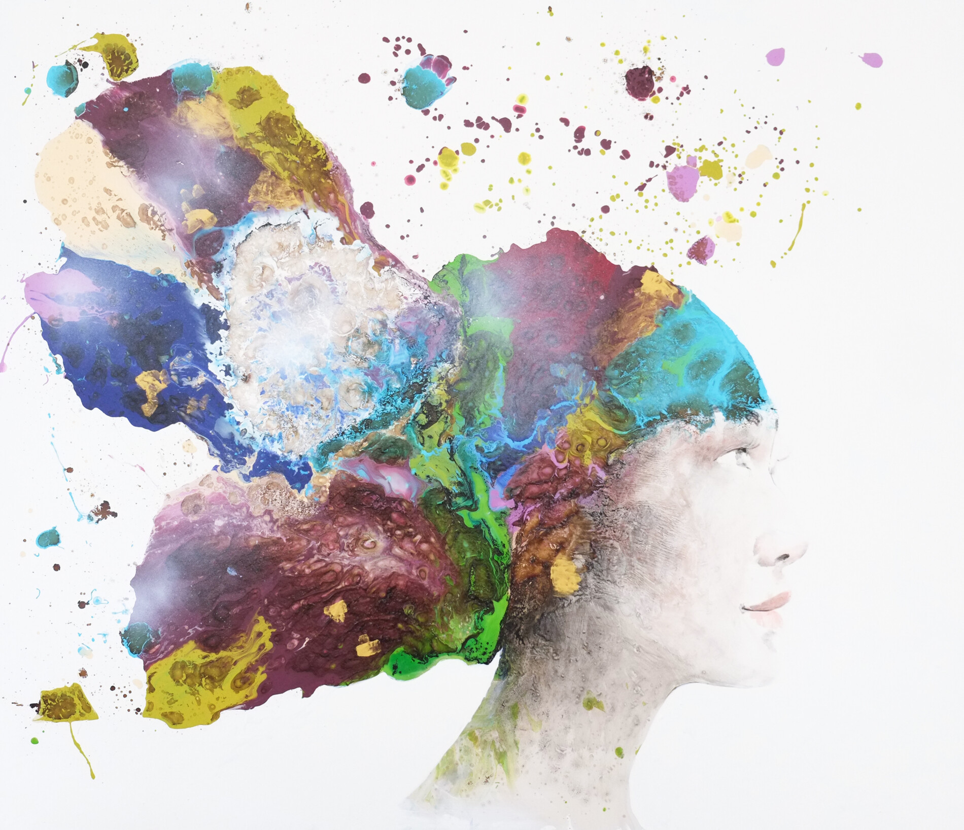 In questa composizione di grandi dimensioni le colature e le stratificazioni degli smalti generano un paesaggio fluido, quasi geologico, che suggerisce trasformazione continua. Nel dialogo tra la delicatezza del volto e la forza del colore si ritrova una delle cifre più riconoscibili di Casetti: trasformare la complessità emotiva in gesto pittorico, lasciando che il colore diventi il vero protagonista del racconto interiore.
