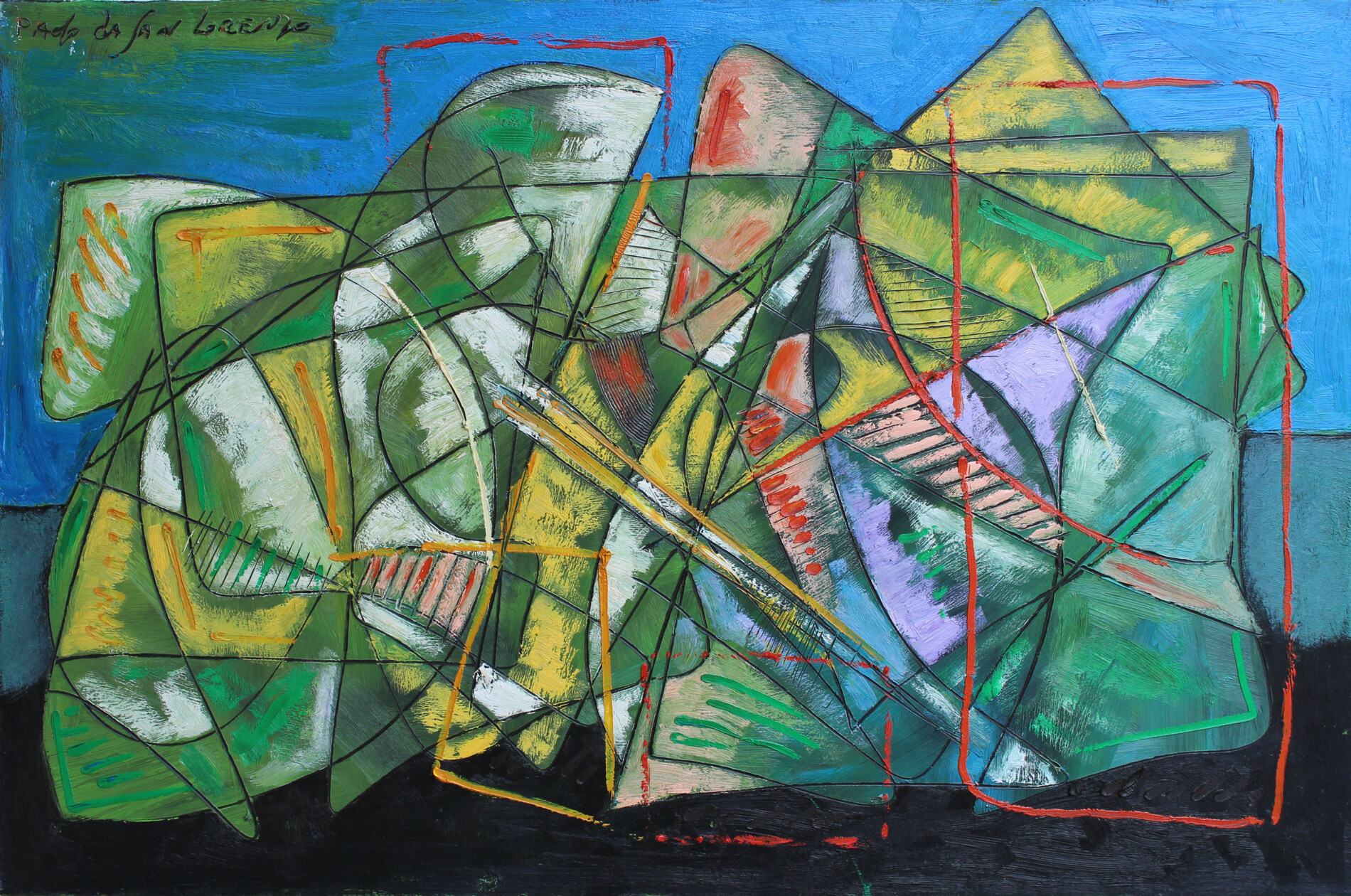 In questa composizione di grandi dimensioni, Paolo da San Lorenzo costruisce uno spazio mentale frammentato, dove forme e colori si intrecciano come visioni sovrapposte. Piani verdi e azzurri, attraversati da segni neri e improvvisi accenti di rosso, disegnano una mappa vivace e pulsante. La pittura diventa flusso, attraversamento, memoria in movimento: un paesaggio interiore sospeso tra struttura e immaginazione.