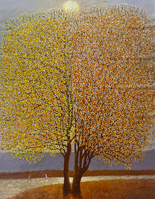 In questa composizione di Je Shen la vibrante fioritura rosata, realizzata petalo per petalo con un contagocce industriale, genera una trama luminosa e quasi tattile che avvolge il paesaggio, mentre la quiete dell’acqua e le piccole casette bianche trasformano la scena in un attimo sospeso di pura contemplazione.