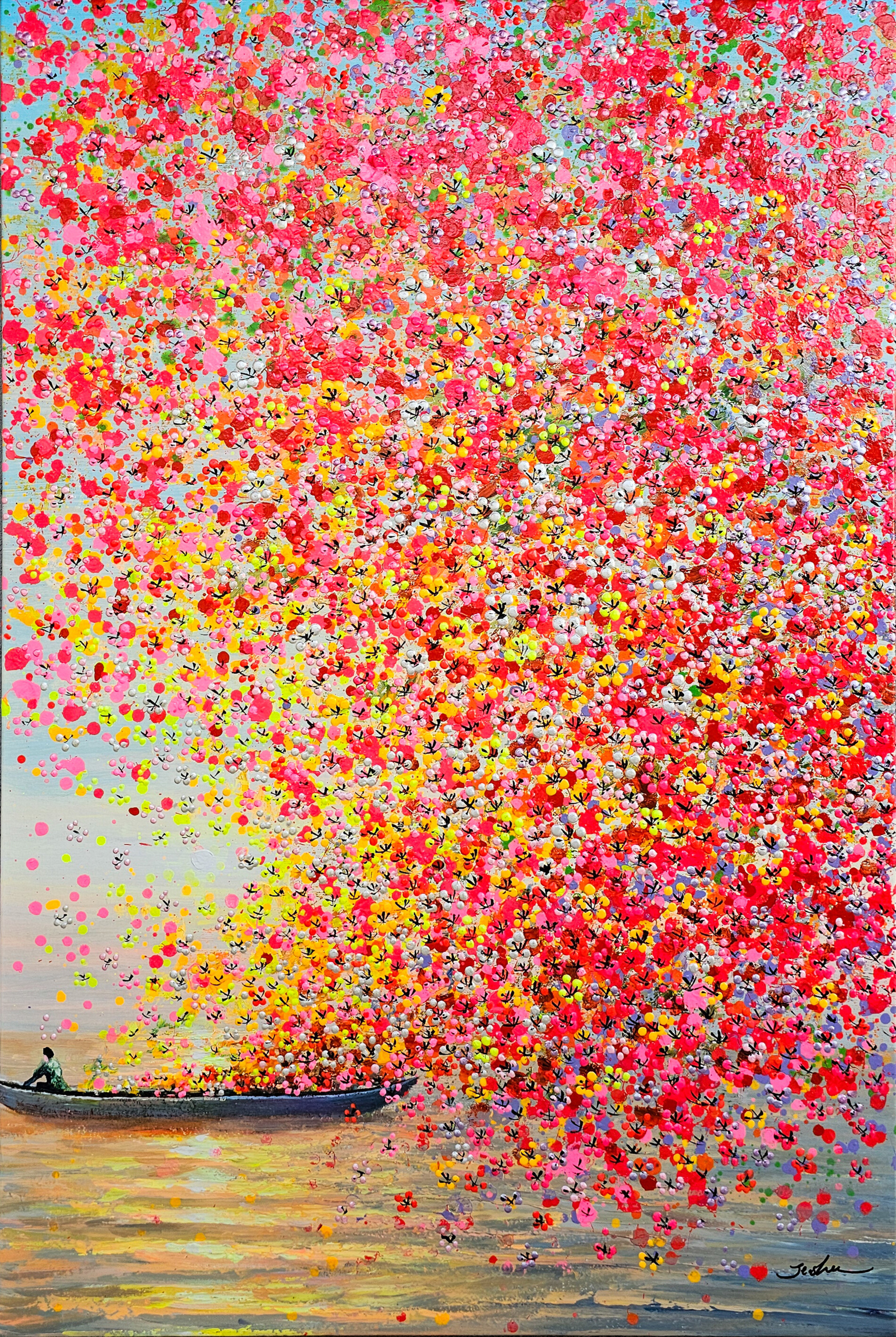Un albero dai rami fitti e delicati si protende a creare una barriera soffusa, avvolgendo un fiume che brilla sotto i riflessi caldi e dorati del tramonto. Un pescatore avanza lentamente a bordo dell’iconica barchetta di Je Shen, come immerso in un tempo sospeso, regalando all’opera un senso di pace contemplativa e intimità.