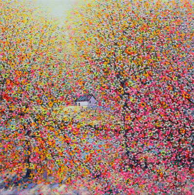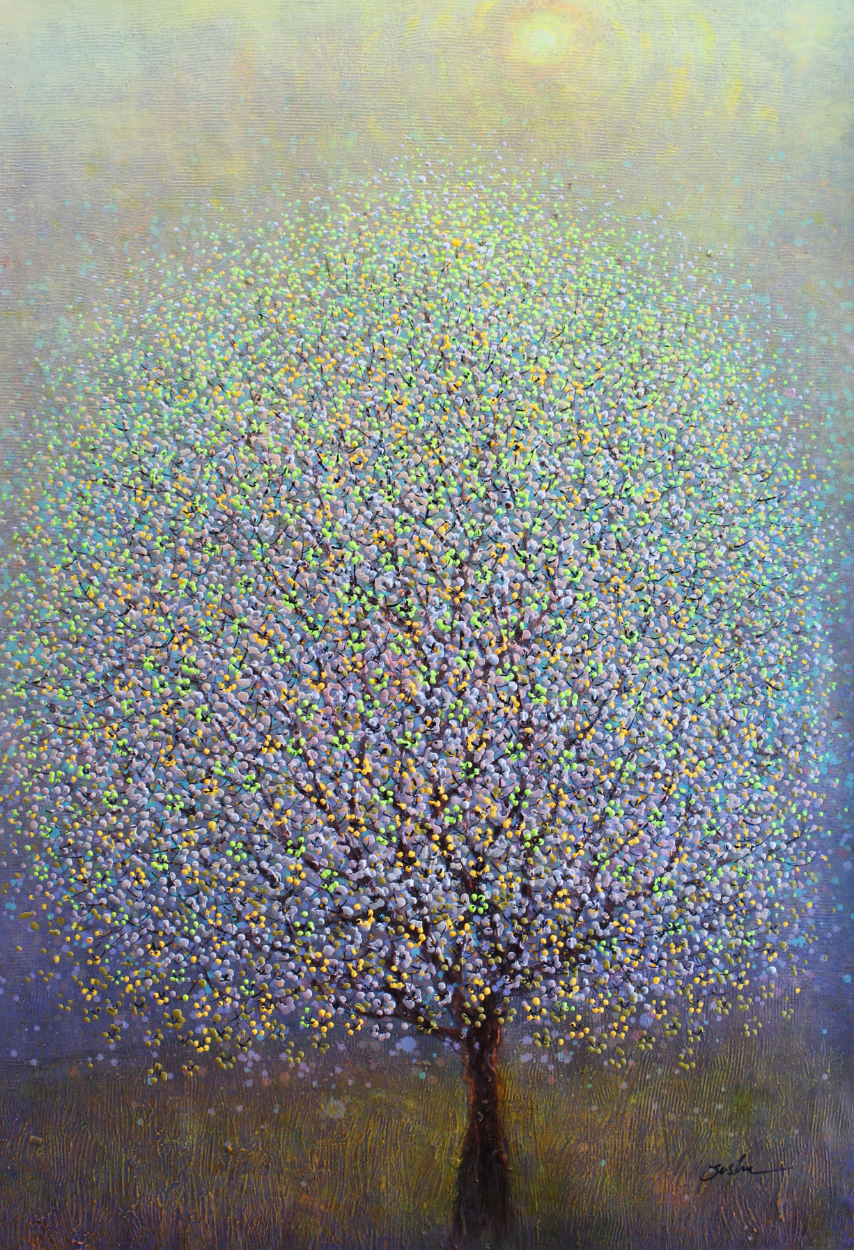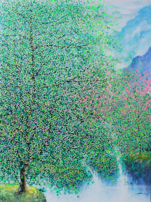 In questo dipinto di grandi dimensioni, i delicati petali lilla e verde menta dell’iconico albero di ciliegio di Je Shen si intrecciano armoniosamente, creando un gioco di colori fresco e vibrante. Questa composizione trasforma la natura in un’esperienza visiva sorprendente.